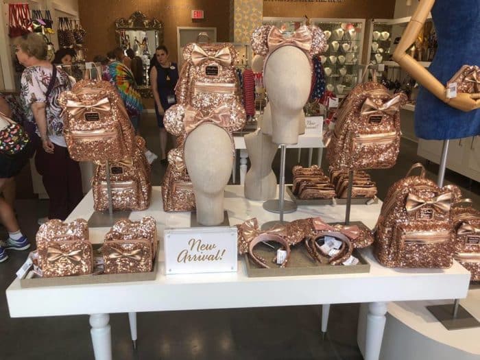 View Rose Gold Disney Backpack PNG. Rose gold sequins on front and sides. Featuring a rose gold sequined design, it includes minnie's ears and her signature bow, while its compact size will fit all your essentials on your next trip to disney parks.